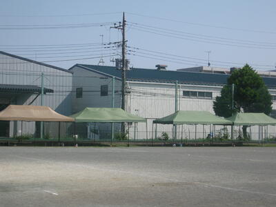 暑さ除けのテントが一部張られ、使用する用具も揃い、準備万端です。いよいよ今週末は運動会本番です。