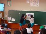 写真は、代表委員会の児童が各学級に行き、紙芝居で赤い羽根共同募金について説明をしている場面です。